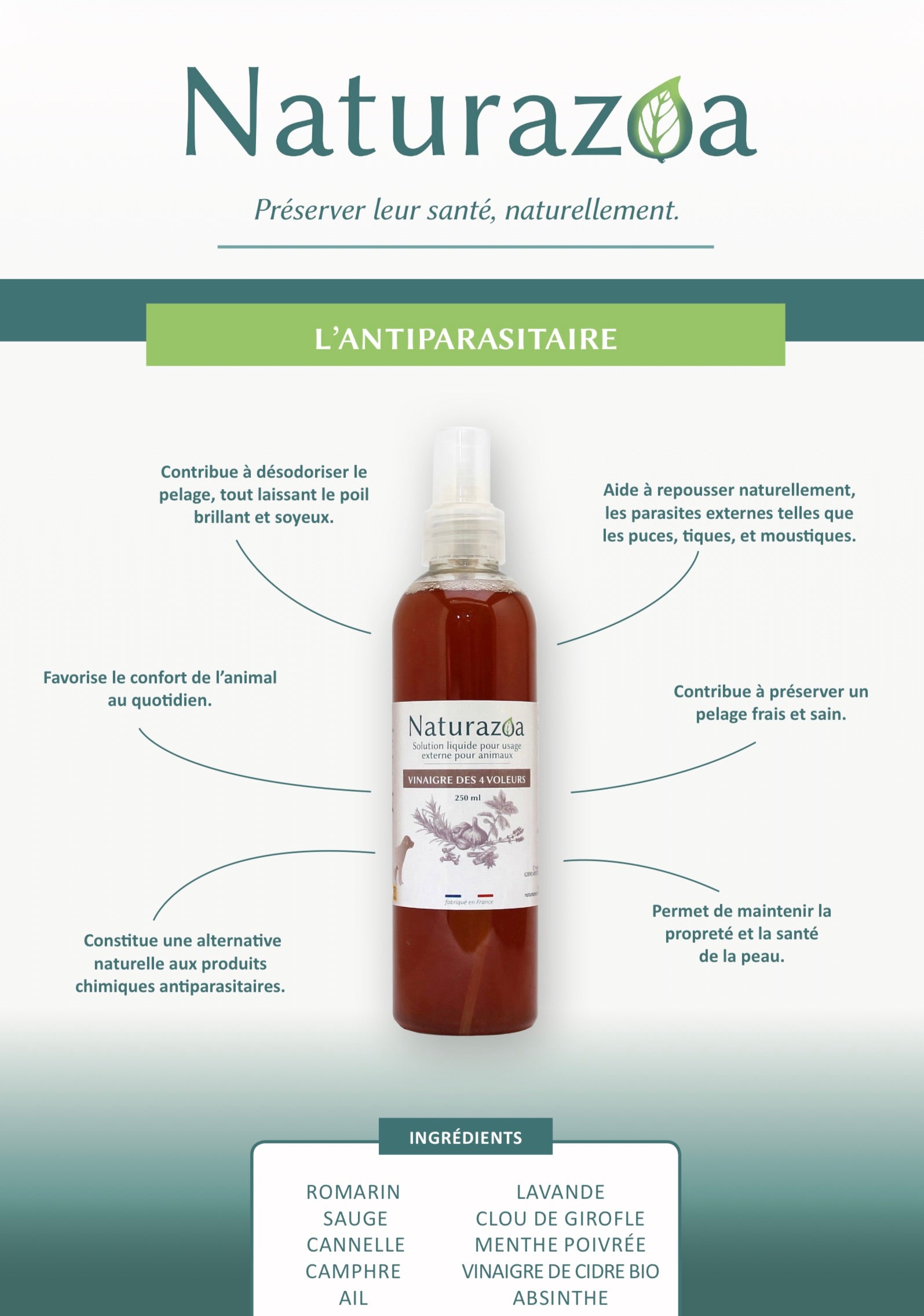Formule naturelle anti-parasitaire pour chiens et chats, notre Vinaigre des 4 Voleurs apaise et protège la peau tout en repoussant puces, tiques, moustiques et autres indésirables.